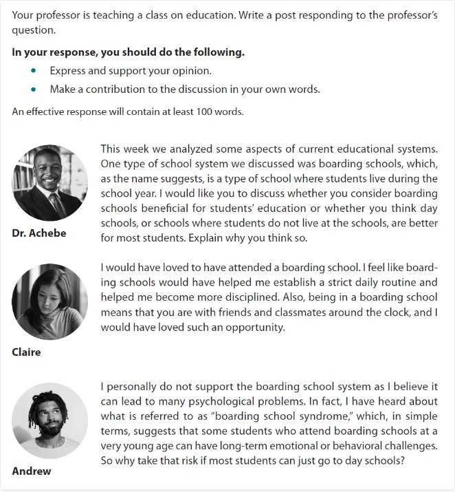 对于托福写作学术讨论新题型,第七版OG更新了全新的题目,有关寄宿学校(Boardingschools)和走读学校(Dayschools)的讨论。