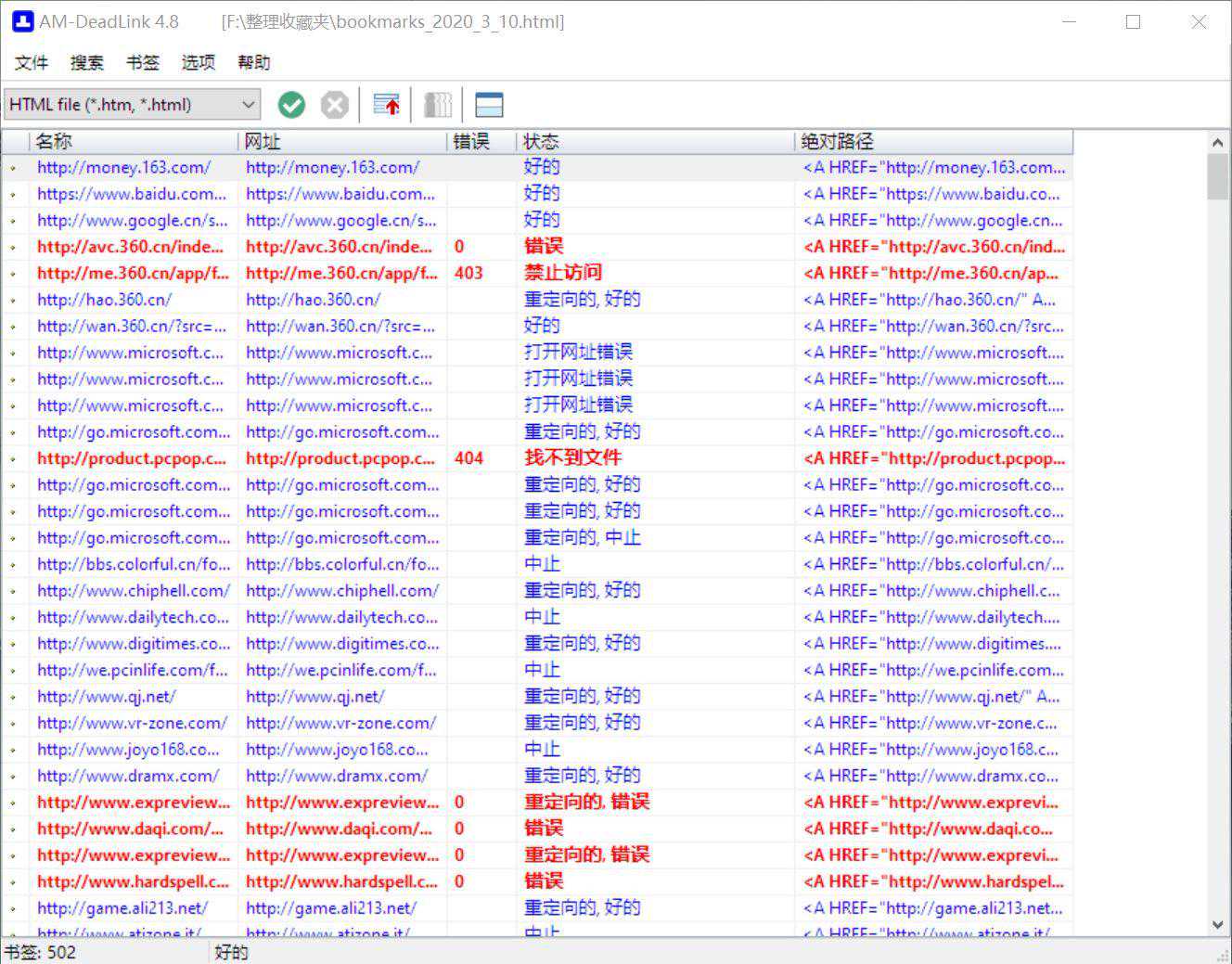 第二步——习惯没养成前的收藏夹怎么整理才好?1、死链终结者——AM-DeadLink最新版本4.8日复一日,年复一年,随着上网时间的增加,浏览器收藏夹中的书签越来越多(收藏控是不是顿时觉得被暴击了),无效书签和重复书签也与日俱增。如何查找并删除这些书签呢?AM-DeadLink,顾名思义,就是专门针对死链的浏览器书签管理工具,它可以帮助你快速检测收藏夹中的无效书签和重复书签。