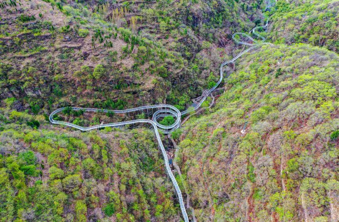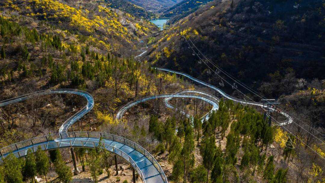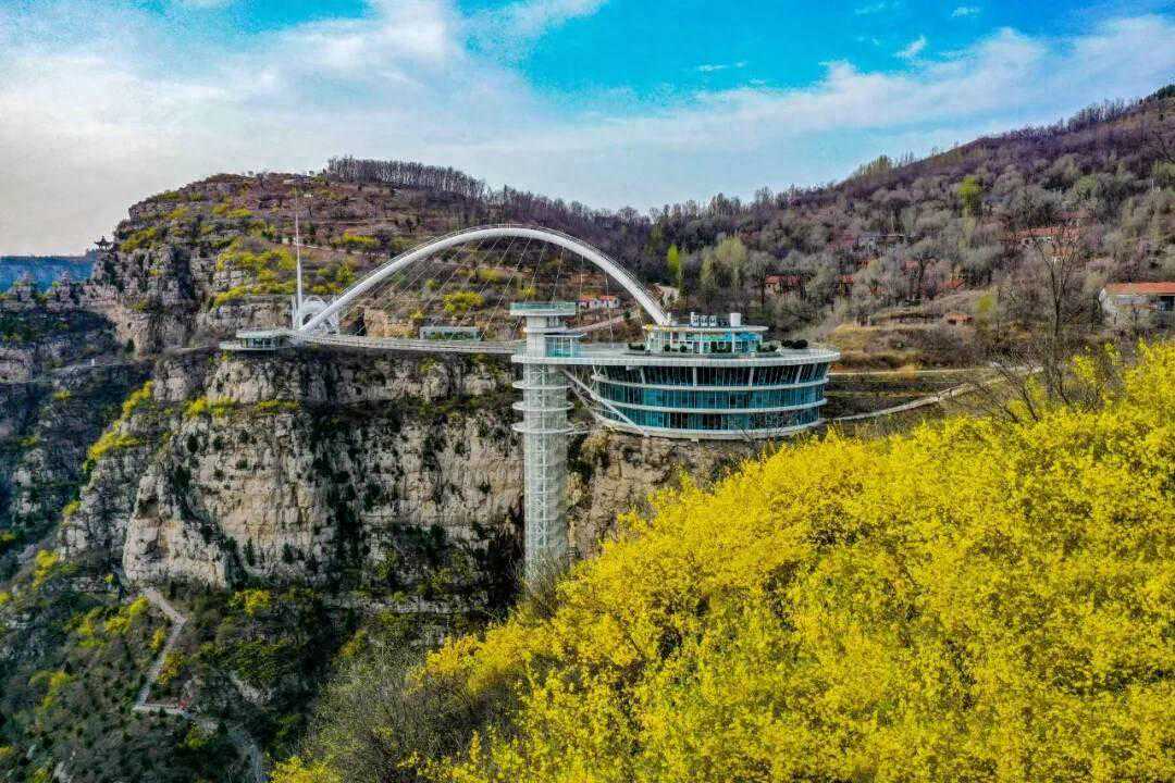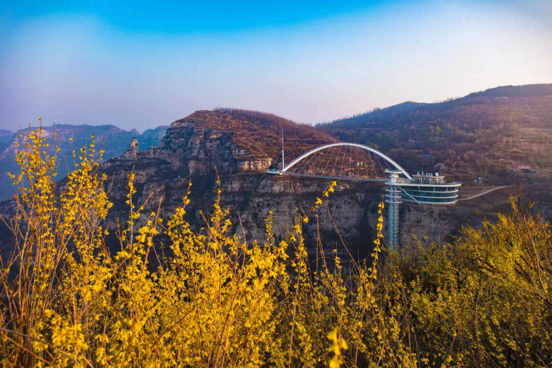 730米高的高空玻璃桥安静而肃穆,这里正是连翘花海的最佳观赏地。春花最佳观赏期预计3月下旬至4月中旬,在青草萌动的泥土中,尽情渲染这十里春风。