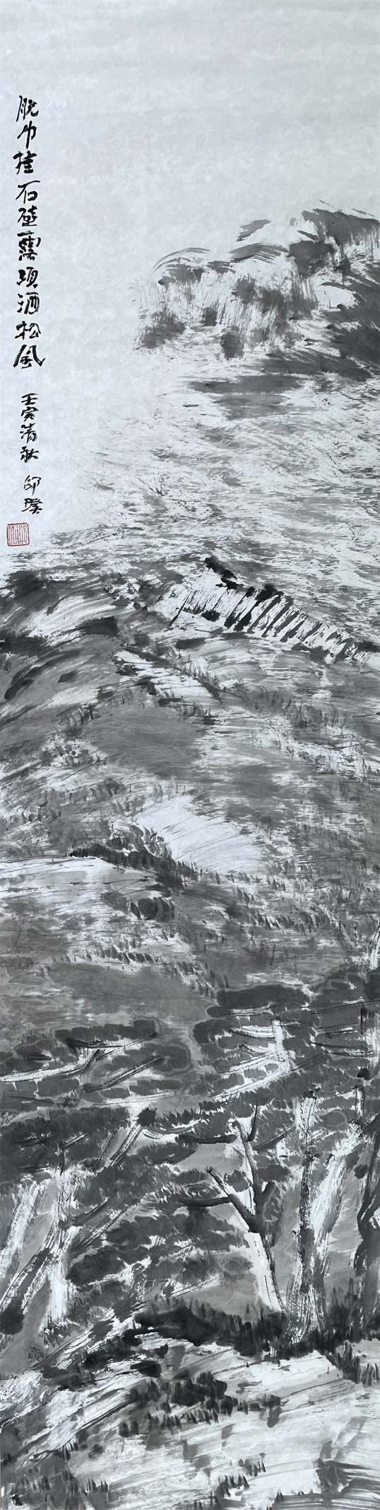 欲造迷人的一片灰,非破前人的用笔习惯而不可得。这是一种大胆、不羁乃至狂傲的尝试,一笔画去,不再是传统的、带中锋或侧锋的一条线,而是齐头并进、粗细不等、井然有序的一个线阵;不再求用笔锋的变化,描画客体的形态与质感,而事以线阵构成的视觉灰,阐释决定客体形状、质感的背后的势和力。此法在传统画法的皴中似曾相识,被邵璞抓在手中,锐意改良,发扬光大,大范围使用,且所涉客体不再限于皴法针对的山石,而是涵盖万千,草木丛林、河池川原、风雨云雾。