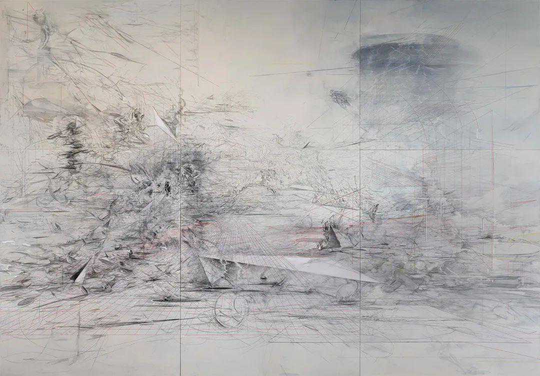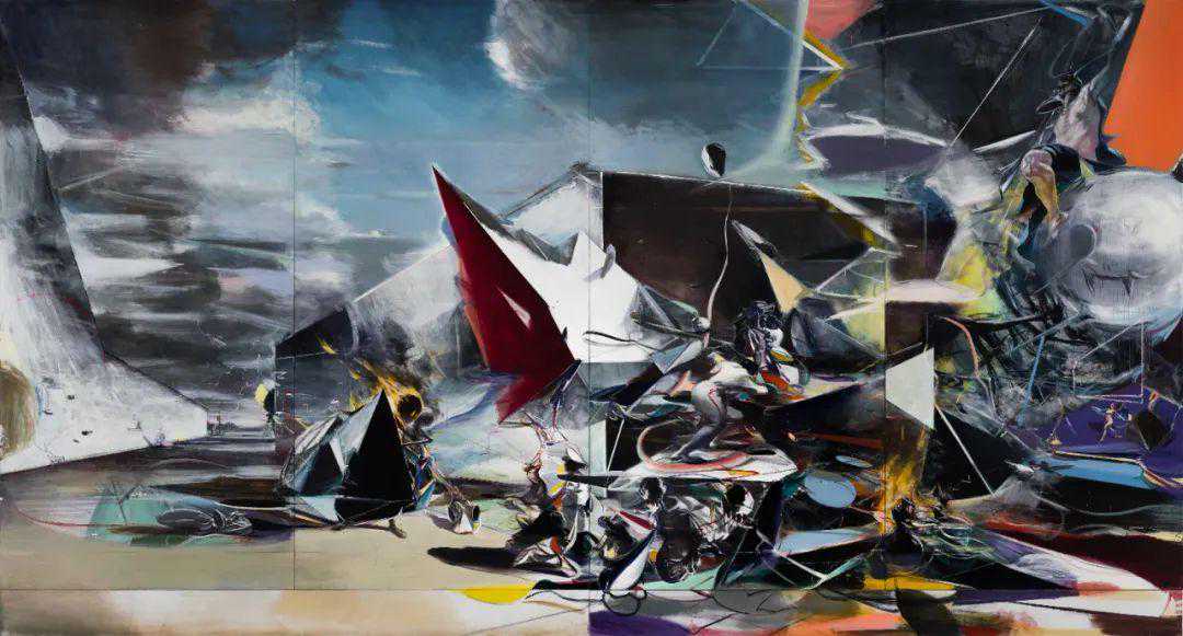 为本次油罐展览和空间特别创作的核心作品《莽原稿》(2021),是贾蔼力迄今为止最大尺幅的绘画作品。全景视觉下色彩、结构和造型在多维度的形态里被置入一场对话,对物质的解构方法和开创性的透视与构成也是艺术家一直探究的创作之路。他在画面上营造出一场“大理石上的天神之战”,那是莽原之初的景象——那里并非荒野,因为过去重重叠叠,留下废墟或大厦。人迹在时空交织中穿梭,无序和理性的角斗场上,万物盘旋上升落下,过去、未来和当下同时降临。