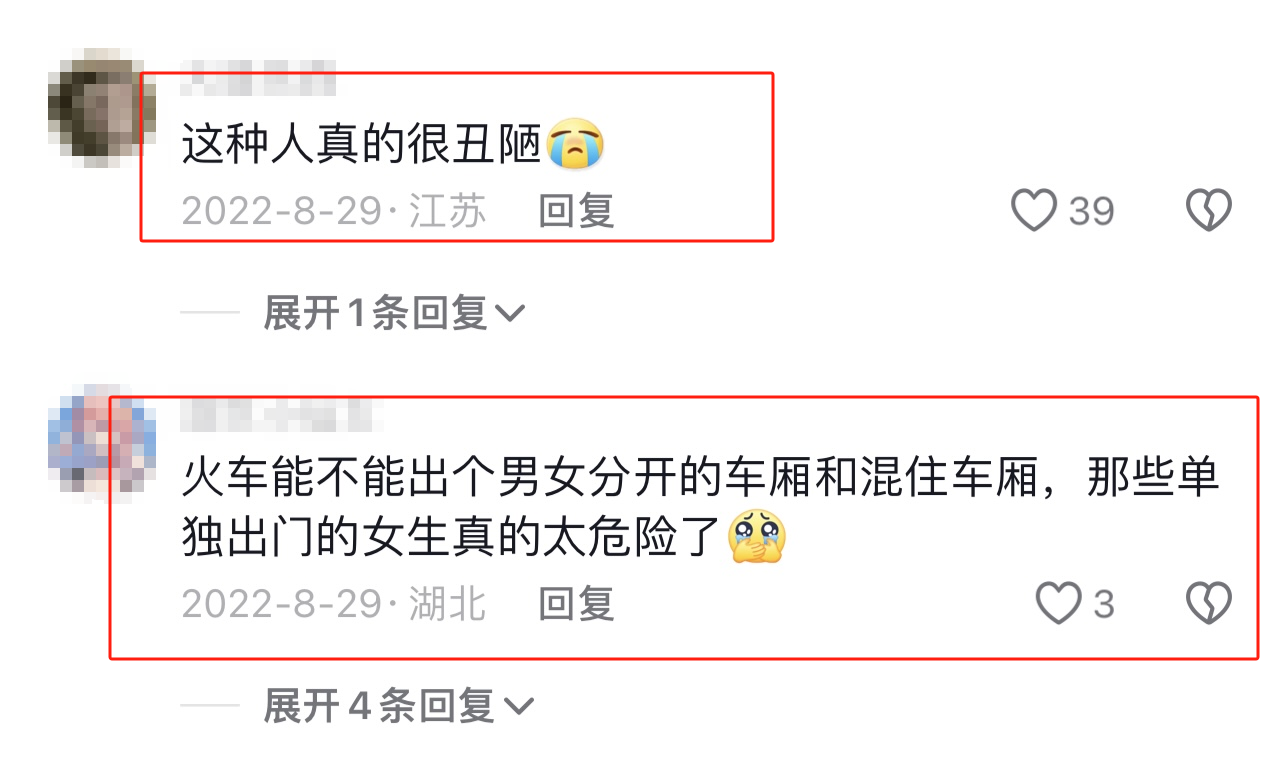 “火车上能不能出一个男女分开的车厢,单独出门的女生真的太危险了。”