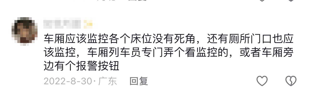 “车厢应该监控哥哥床位,没有死角的那种,或者车厢旁边安装一个报警按钮。”