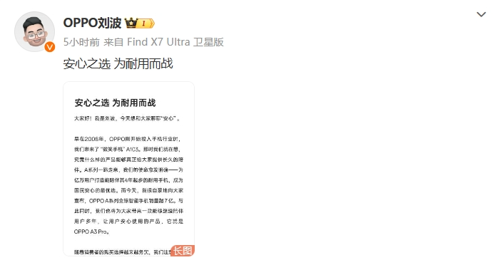 OPPO中国区总裁刘波表示,OPPOA系列全球智能手机销量已超过7亿台。OPPO耐用科技将在A系列首发,OPPOA3Pro是史上首个“满级防水”手机,并且在出色的防水防尘能力基础上,还兼具旗舰级的抗摔耐磨性能和长效续航能力。此外,OPPO在上一代产品A2Pro上带来行业首创的“四年电池保”,这次也会进一步升级,让耐用手机变得双倍耐用,成为真正的“耐用战神”。