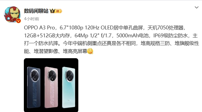另外,数码博主@数码闲聊站今日的一份爆料中提到了OPPOA3Pro的配置信息。