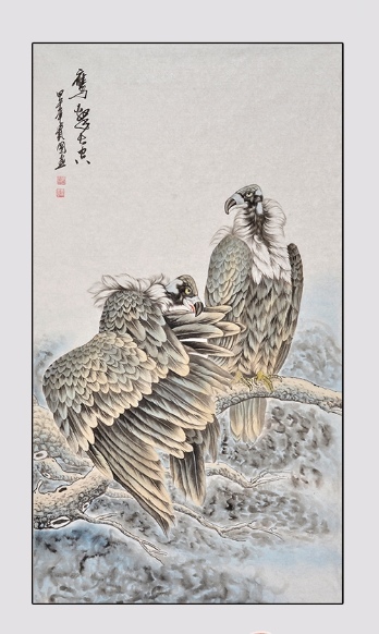 王贵国六尺竖幅动物画雄鹰图《鹰击长空》,构图讲究,造型奇特,用笔洒脱,双鹰炯目视之,老鹫憩之。此幅国画作品堪称经典,鹰的头部、爪部势壮雄强,斩钉截铁,聚精会神地在思索着,似乎瞬间将要振翅高飞,有一种大展宏图之势。