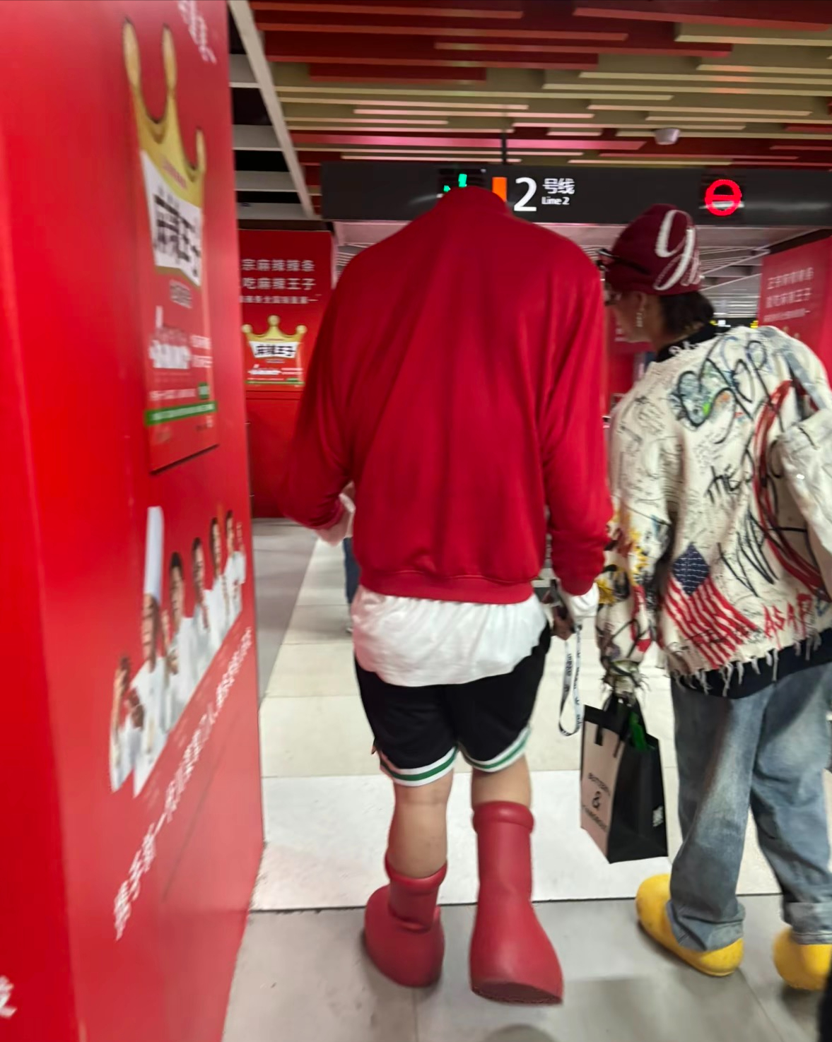 只见两个人肩并肩走过来,但眼神完全被红色外套衣服的小伙子吸引住了。