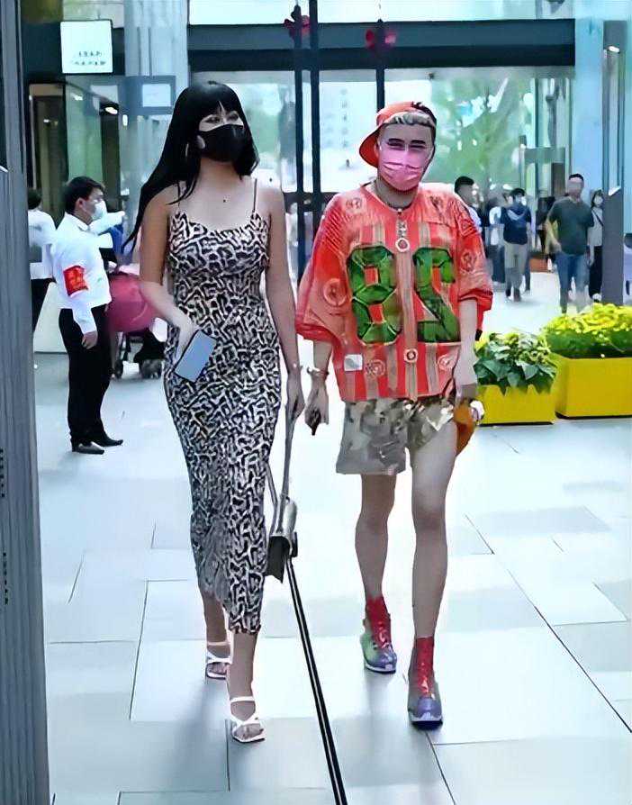 黑长直的女生一袭豹纹吊带裙在人群中,挺吸睛的,但对比旁边的男子,简直有些朴素了。