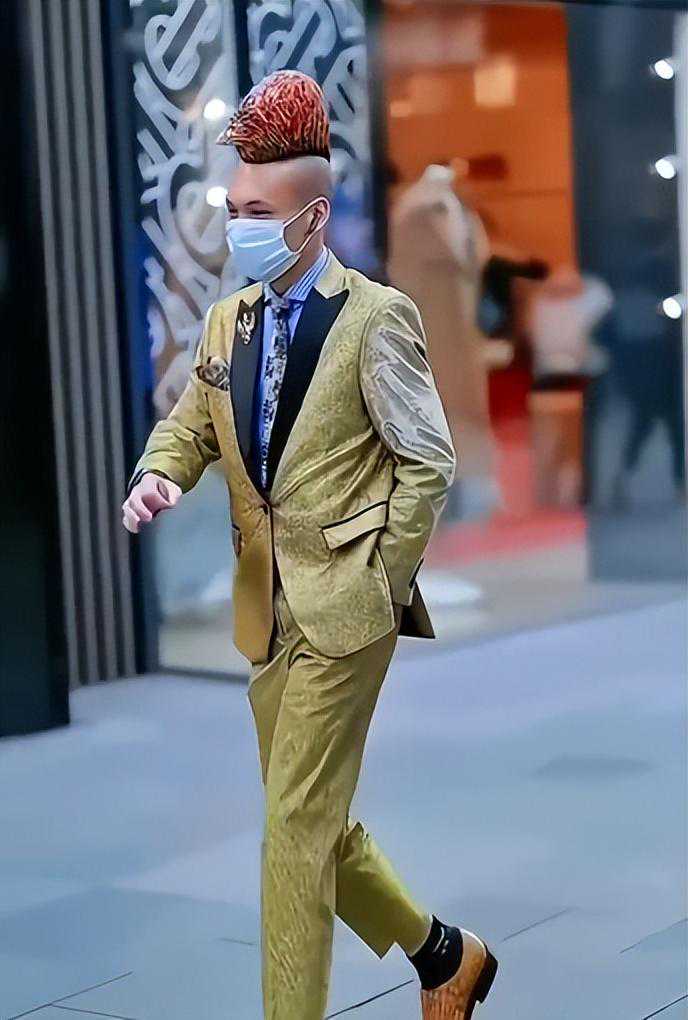 见过在头上做造型的,还第一次见在头上做鸡冠的,还搭配着绿色的西装,是准备把动物世界安在身上?