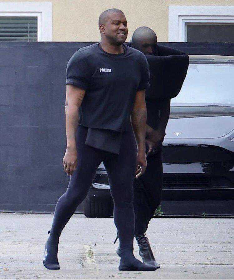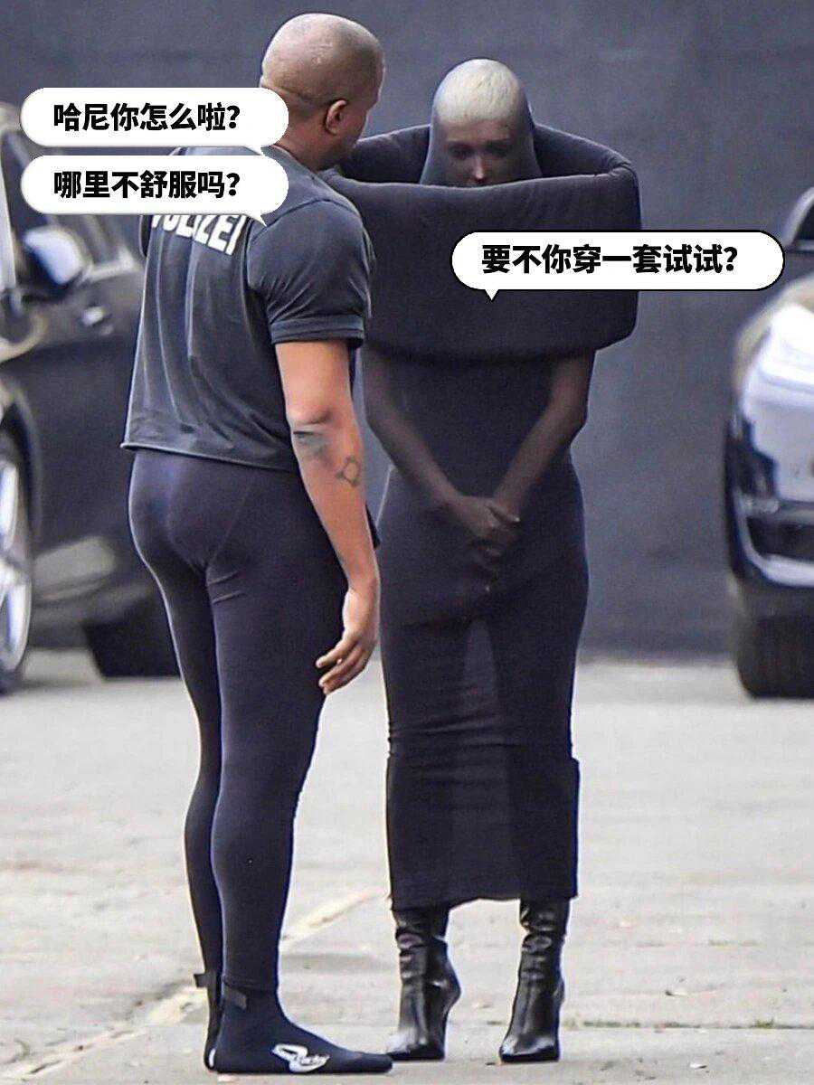 只见侃爷的妻子一身黑的搭配,但是这丝袜怎么裹在头上了,不仅头给裹上了,就连胳膊也都给封印了。