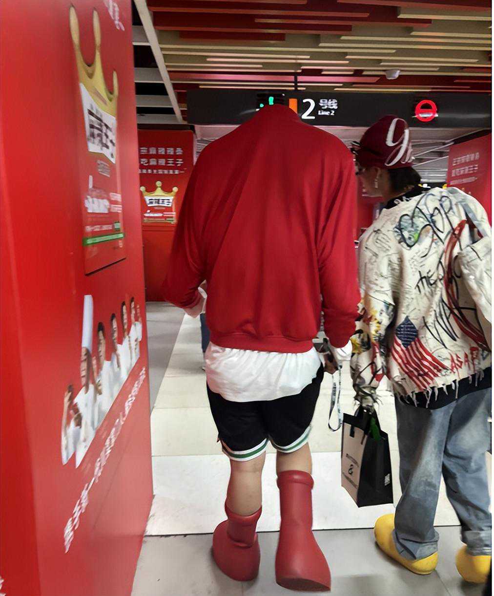 旁边男子的鞋子也是如出一辙,这黄色的大头鞋,是把柚子剥了剥改装成鞋子了?