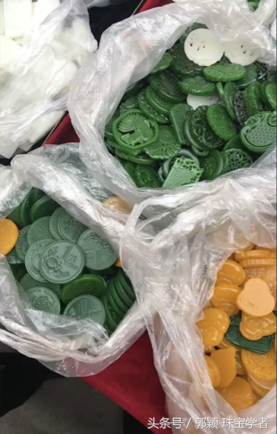 “外蒙料”在玉器批发市场上有很多,因为和田玉“俄料”、“韩料”等类别,“外蒙料”这个名字似乎带有了产地特征,很有迷惑性。但是仔细观察就知道这种东西并非天然玉石:整块玉石颜色十分均匀鲜艳,几块“玉石”颜色无差别,打透光无玉石结构,朦胧而均匀。