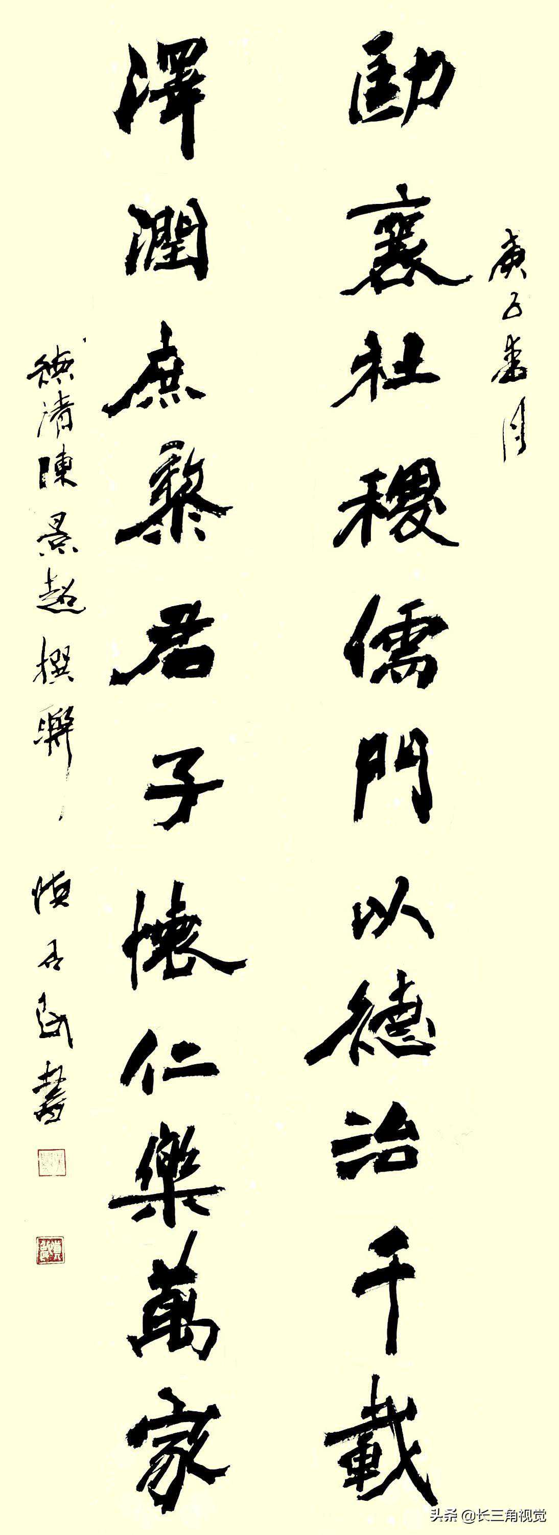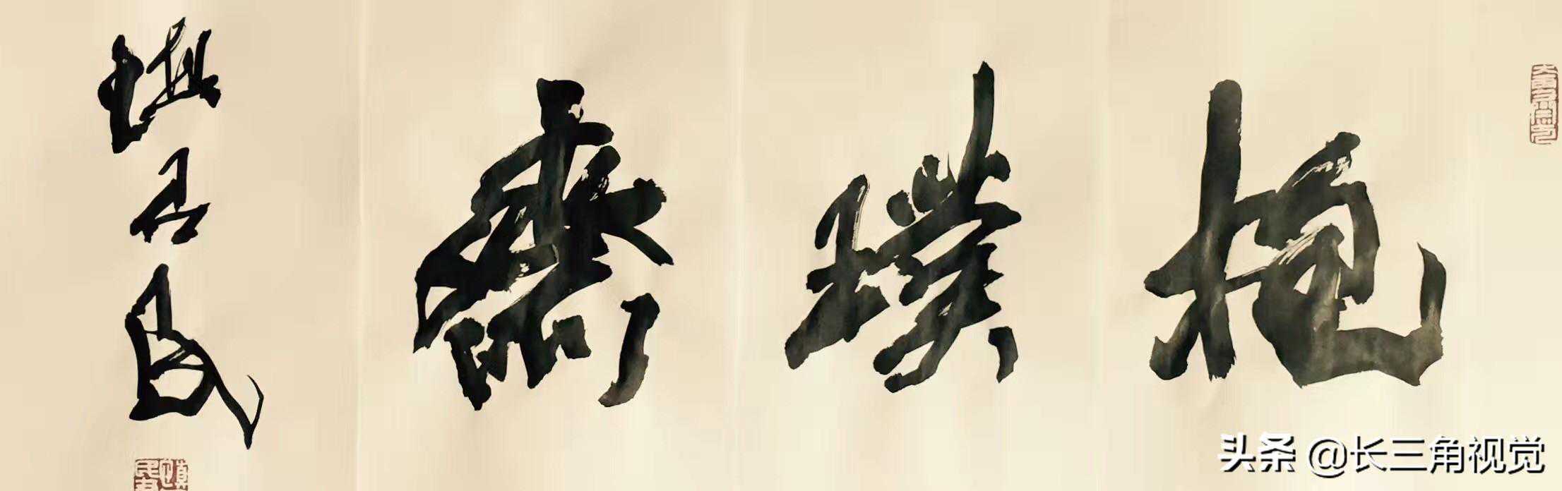 坦白地说,榜书与巨字的结构和形态有所不同,榜书是平面艺术,巨字将人与笔放在一个更大的立体三维空间,比榜书更加雄健厚重,遒劲蒼莽、刚劲有力、结构严谨、视觉冲击力更强,这需数十年的实践和磨砺。现代人写巨字比前人更难,因为我们无可“依傍”,无可“仰仗”。当年,名帖《瘗鹤铭》“依傍”与“仰仗”高峻的焦山和喷涌的长江,所以气势如虹;《石径峪》则“依傍”巍也泰山,也自成嵯峨。现代人写巨字的时候只能依托自己的精气神,如翼德之于长板坡一马当前,舞一矛而轻万军,你手执巨笔,面对千万观者,只有奋不顾身,因为无路可退,只有挟笔疾书,让天地融为一体……
