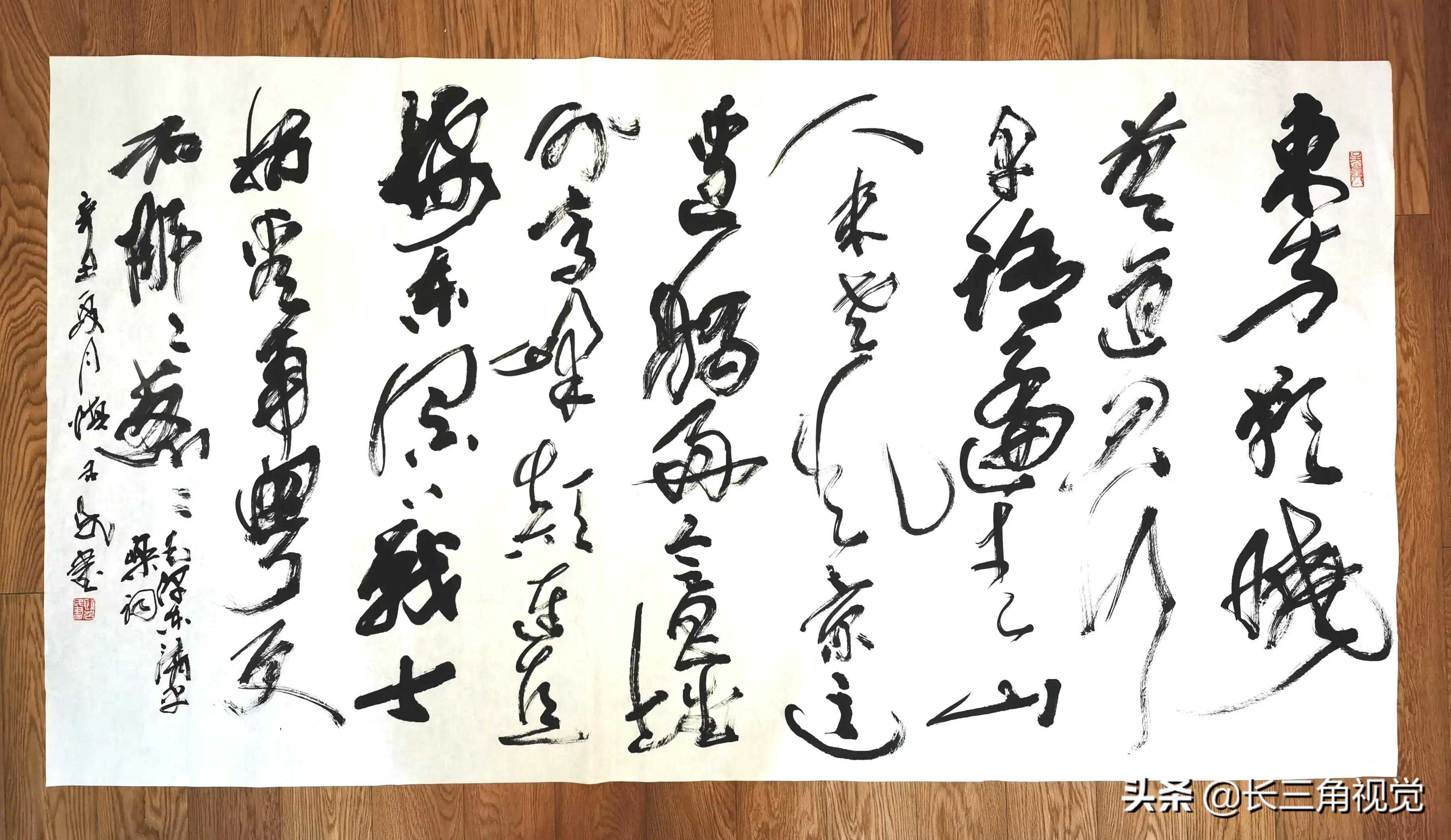 九十年代初,上海电影制片厂来湖州拍摄古装剧《湖笔情怀》拍摄音乐片,寻找写大字的替身演员,看中了我,设想要用巨笔在四十平方米上写“吴越”两个大字。多年练就的体魄和传统榜书功力,让我大笔一挥,形态和字体都让导演称绝,一举哄动圈内,这是我第一次在荧屏上露脸。由此不少媒体闻讯而来,澳门回归,写下1999平方米巨幅对联,现场观看的浙江省书协主席朱关田先生称为“天下第一对联”,次日,中央电视台新闻联播报道。2011年首届国际湖笔文化节上,用81.5公斤湖笔,写下600平方米“湖笔”两个大字,並获得世界吉尼斯纪录证书。2006年多哈亚运会闭幕式上用巨笔写下近八十平方米“和谐亚洲”,世界大学生运动会国内首场比赛在清华大学体育馆举行,现场写了100平方米“无畏向上”,浙江省台湾周活动,在台北写下100平方米“同脉同根”,2014年联合国成立七十周年之前,纽约联合国总部榜书“百鸟聚巢”,2019年亚洲嘉年华在北京鸟巢国家体育场,现场写了五十平方米“合”字,世界运河大会于扬州现场巨笔演示……