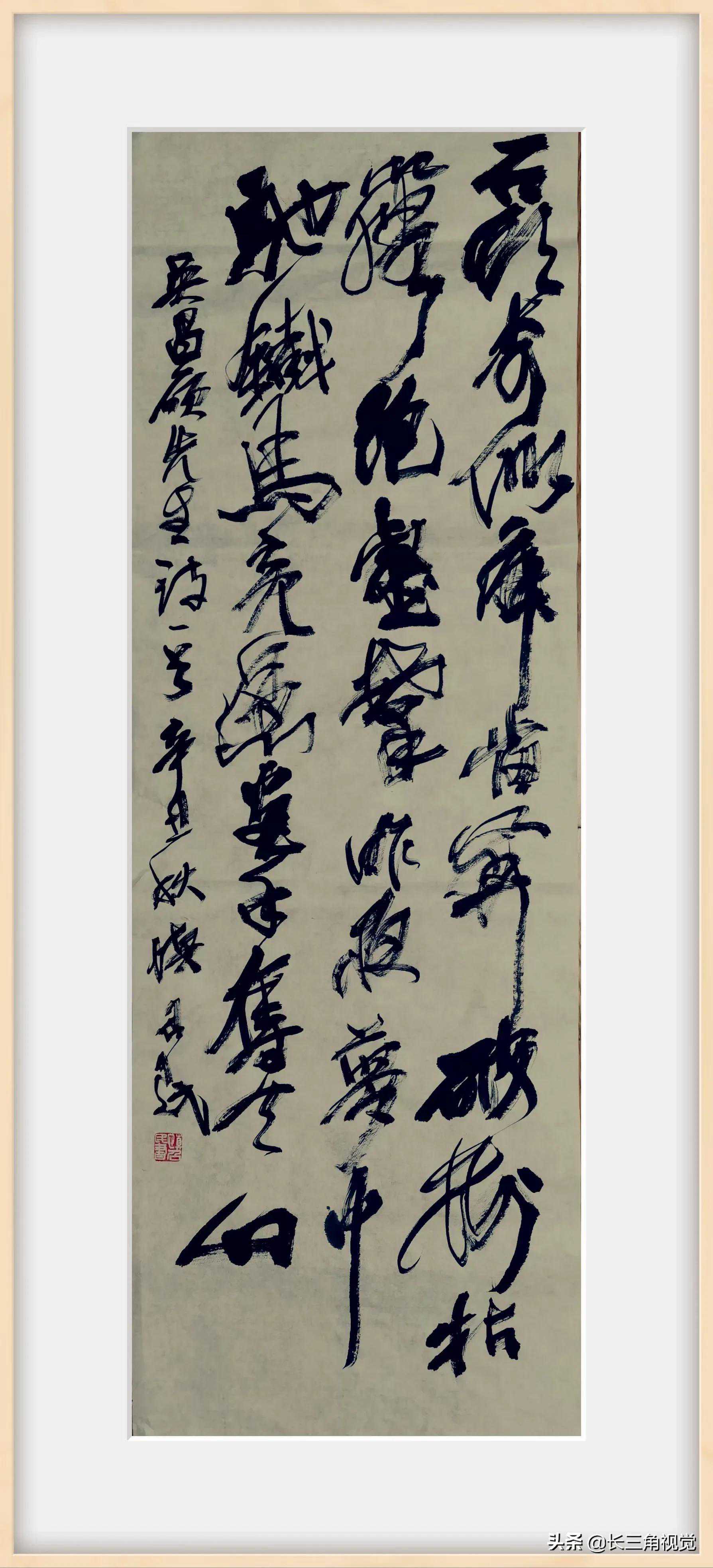 九十年代开始,随着形势发展的需要,榜书和大字有了市场需求,字也越写越大,我开始练习铁笔巨字,这是一种全新的艺术表现形式,一种新的追求。从技术层面上讲,大字是指在手臂半径操着范围之内的,而巨字在力量和艺术上都进入了一更高的层次,既要书法的底蕴,又要武术身段的支持。巨字书法需超重大笔,必须练习手臂力量,为此,近五十岁的我,又单手练石锁,铁亚铃,冬夏不懈,既增加了腕力,又强身健体。往往一幅巨笔书法完成以后,如剑客舞刃,刀头舔血,大汗淋漓,但已浑不知自己手上笔还是刀,写出的字还是人的血魂。技术已完全融化成为书道……