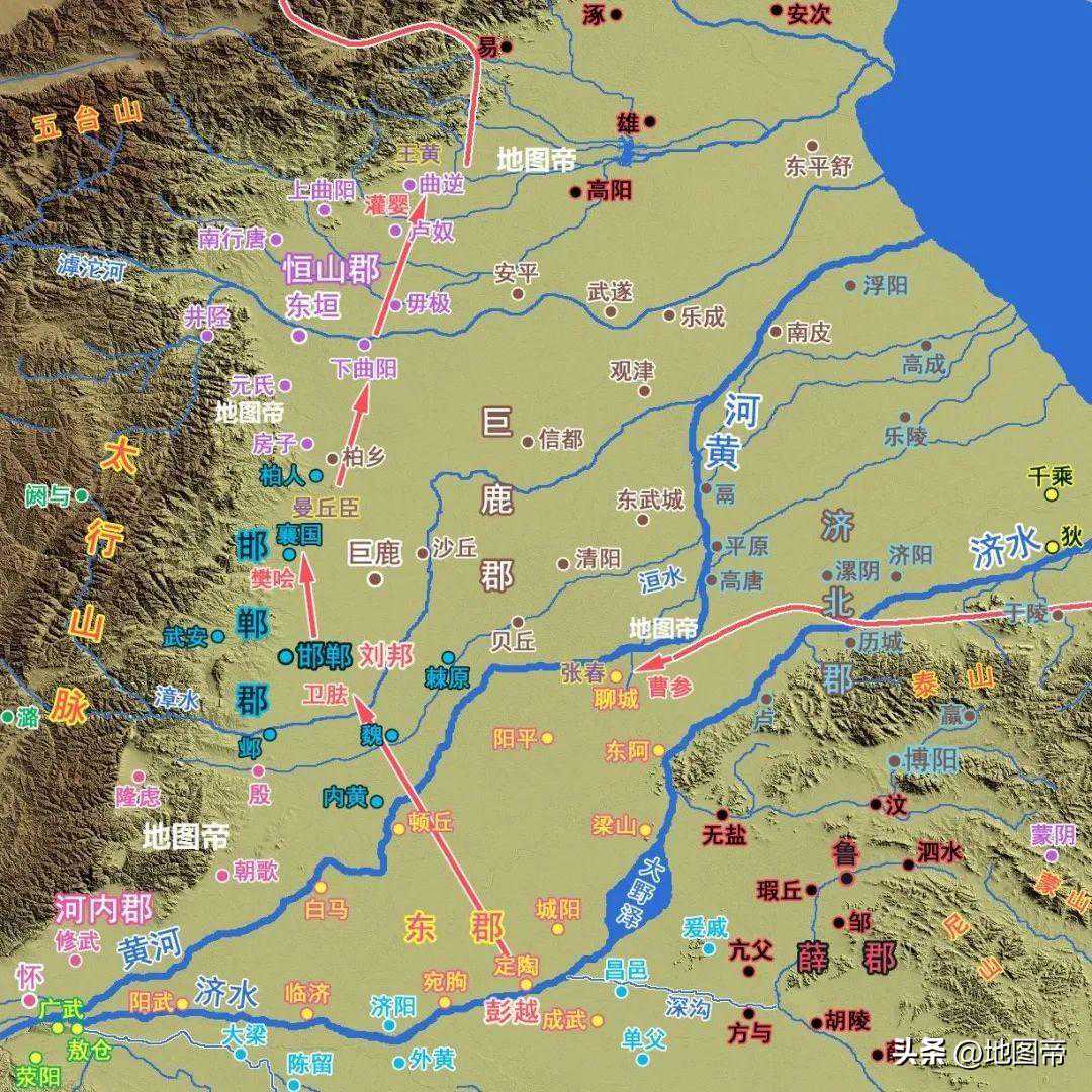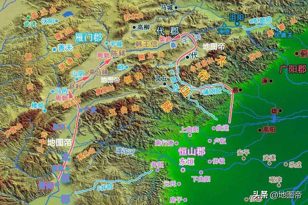 柴武则统率步兵,走“7飞狐陉”、“6蒲阴陉”登上太行山,与周勃东西夹击叛军。