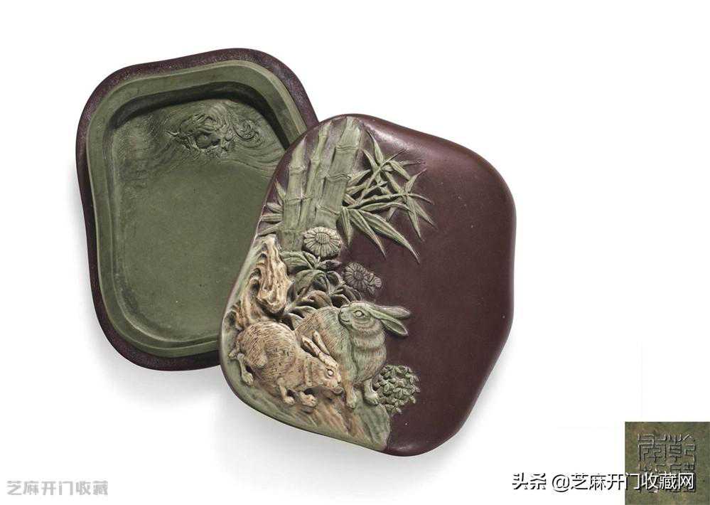 4:清乾隆御制松花石雕龙纹砚配双兔呈祥盖盒,尺寸:长6.4厘米;长7.2厘米,估价:USD50万,成交万