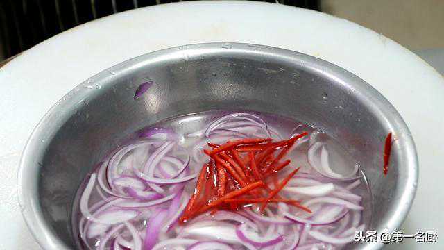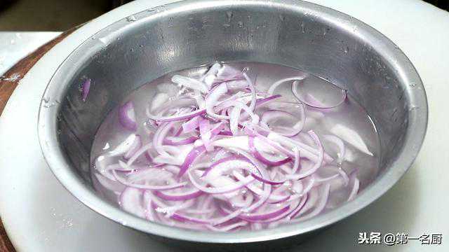 准备洋葱半个切成片,放入盆中,加入适量清水,用手抓散,这一步是为了减少洋葱的辣味,也能防止洋葱刺激到眼睛。