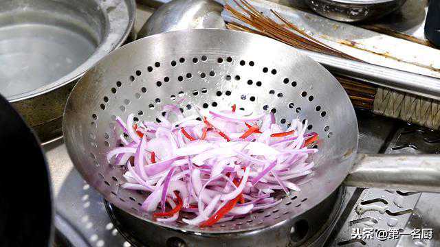 然后把洋葱和红椒倒入漏勺中,控干水分再倒入盆中。