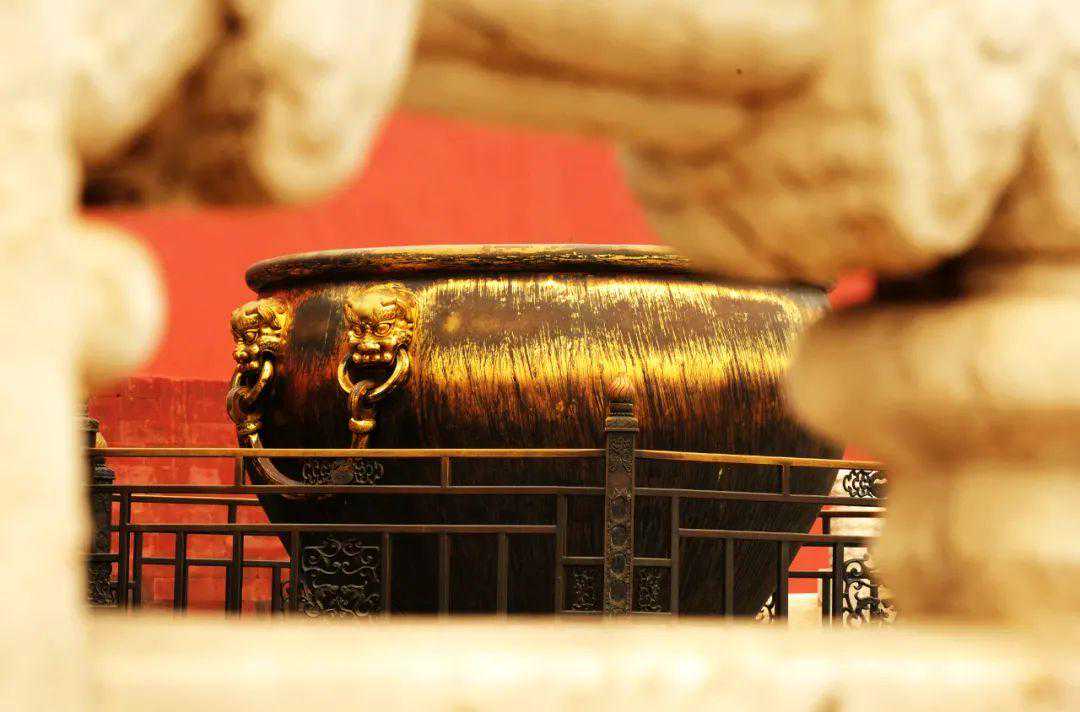 宫中设置大量铜缸的最初意图是用来防火的,但其实际存在的价值绝不仅仅局限于消防,同时它还是宫内大殿、庭院中不可或缺的陈列品。鎏金铜缸等级最高,因此要设列在皇帝上朝议政的太和殿、保和殿两侧以及用于御门听政的乾清门外红墙前边。而在后宫及东西长街,就只能陈设较小的铜缸或铁缸了。