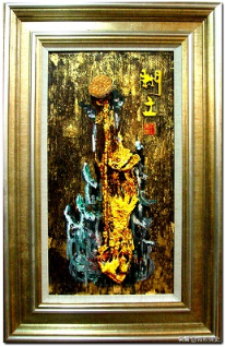 这幅《阙立》壁画作品传统而又时尚、对立而又统一的风格让人眼前一亮,作品仅平方米的面积有浮雕与园雕、写意与写实,同时揉合了铜雕、国画、书法及油画多种技法。在经氧化、磨抛而筋骨突现的贴铜杉木基板上,呈现着黑古铜色的神秘深沉,以熔铜工艺中自然流淌挂落而产生的精灵般的艺术浮雕造型,闪耀着富贵而祥和的光彩。在表现上,莲荷的大写意的枝叶与失腊精铸的极为写实的莲蓬圆雕别具匠心地组成一幅挺拔阀立、独具质感的艺术作品,抽象与具象完美地融合在一起。体现着中国传统文化的精髓,又无时不刻地散发着现代时尚理念的精华。