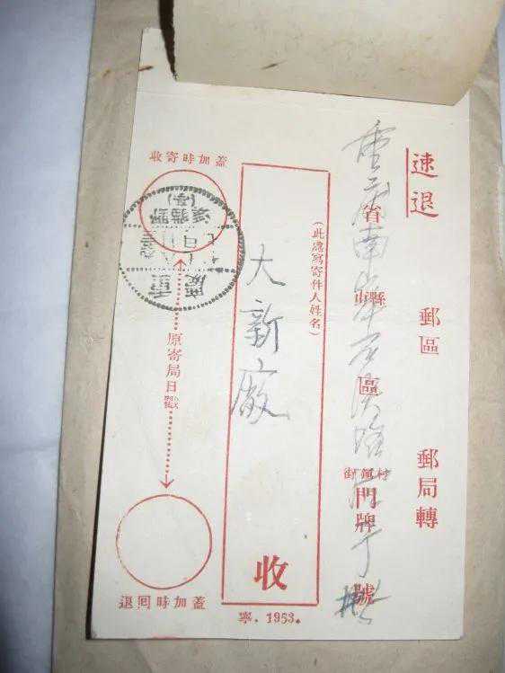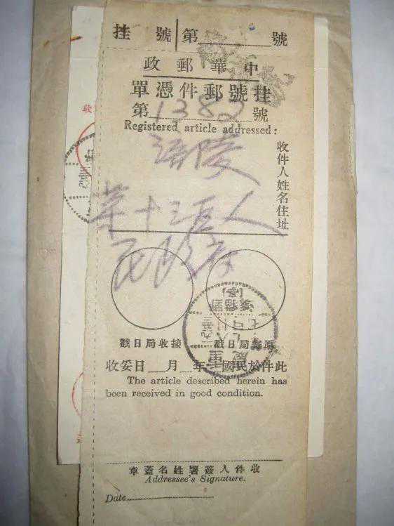 比较稀罕的是这个实寄封,退回的贴条挂号邮件凭单却是中华民国的“中华邮政”,这个凭单明显是解放前的印刷品,印刷的时间落款都是“此件于民国年月日”。