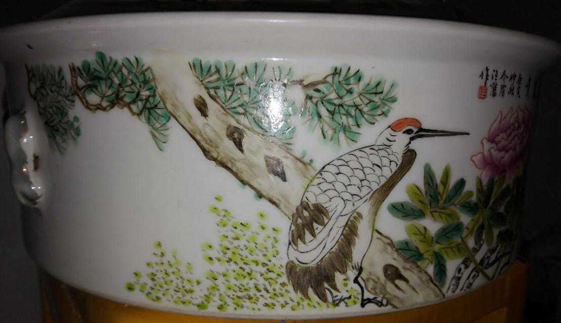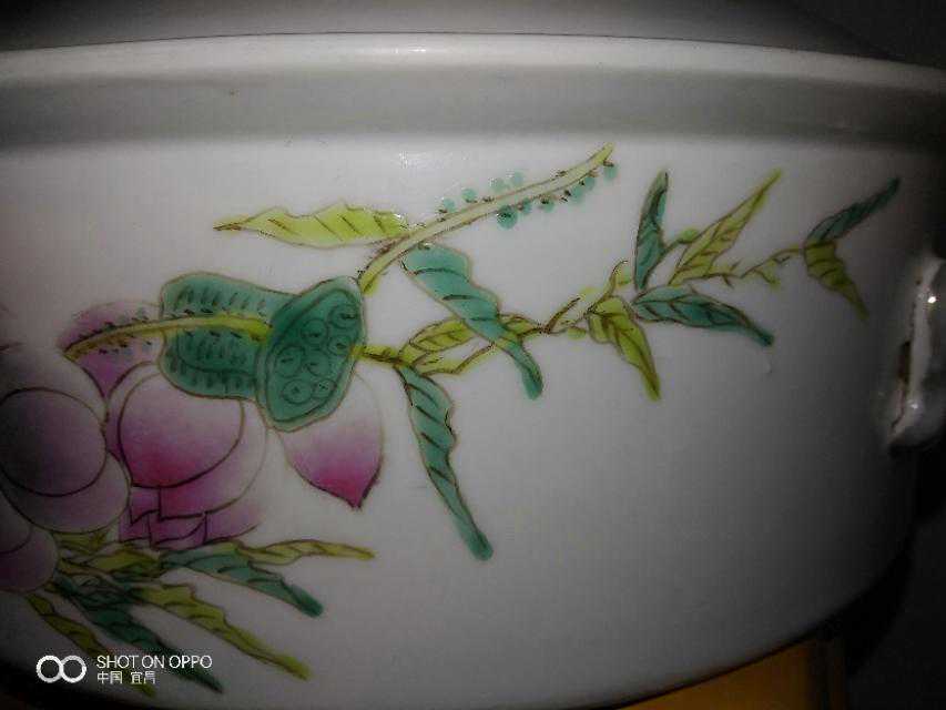 器盖上纹饰:仙鹤、松石、牡丹、灵芝;器壁上二组纹饰:一组为古松、仙鹤、牡丹,一组为仙桃、佛手、石榴、葡萄。仙鹤,古人称之为“一品鸟”;仙桃、佛手、石榴、葡萄、灵芝、牡丹、古松、仙鹤,这些纹饰组合喻意“多子、多福、多寿、富贵”,也被称之为“三多纹”。此器造型规整、画工精湛,着色雅丽、质感强,应为浅降彩瓷精品。瓷器图片如下,欢迎品赏。