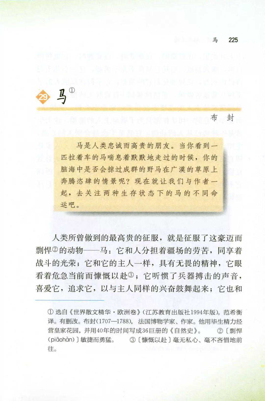 《马》是法国博物学家布封的作品。布封是人文主义思想的继承者和宣传者,在他的作品中惯常用人性化的笔触描摹动物。像课文中的马就被赋予了人性的光彩,它像英勇忠义的战士,又像驯服诚实的奴仆,像豪迈而犷野的游侠,又像典雅高贵的绅士。