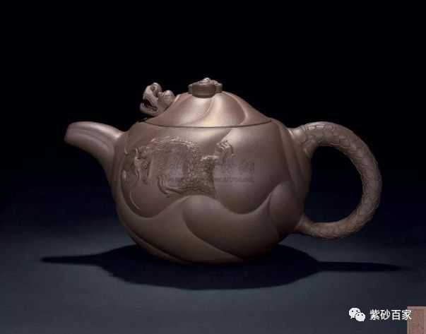 此壶造型构思巧妙,脱胎于鱼跃龙门的故事,蕴涵飞黄腾达、平步青云的理想。壶体砂质温润细腻,紫里透红。壶面饰云浪纹,生动和顺,舒展流畅。鱼、龙、云浮雕装饰与壶身浑然一体,刻画精细,出神入化。通身作海水波浪状,线条流利,简洁明快。