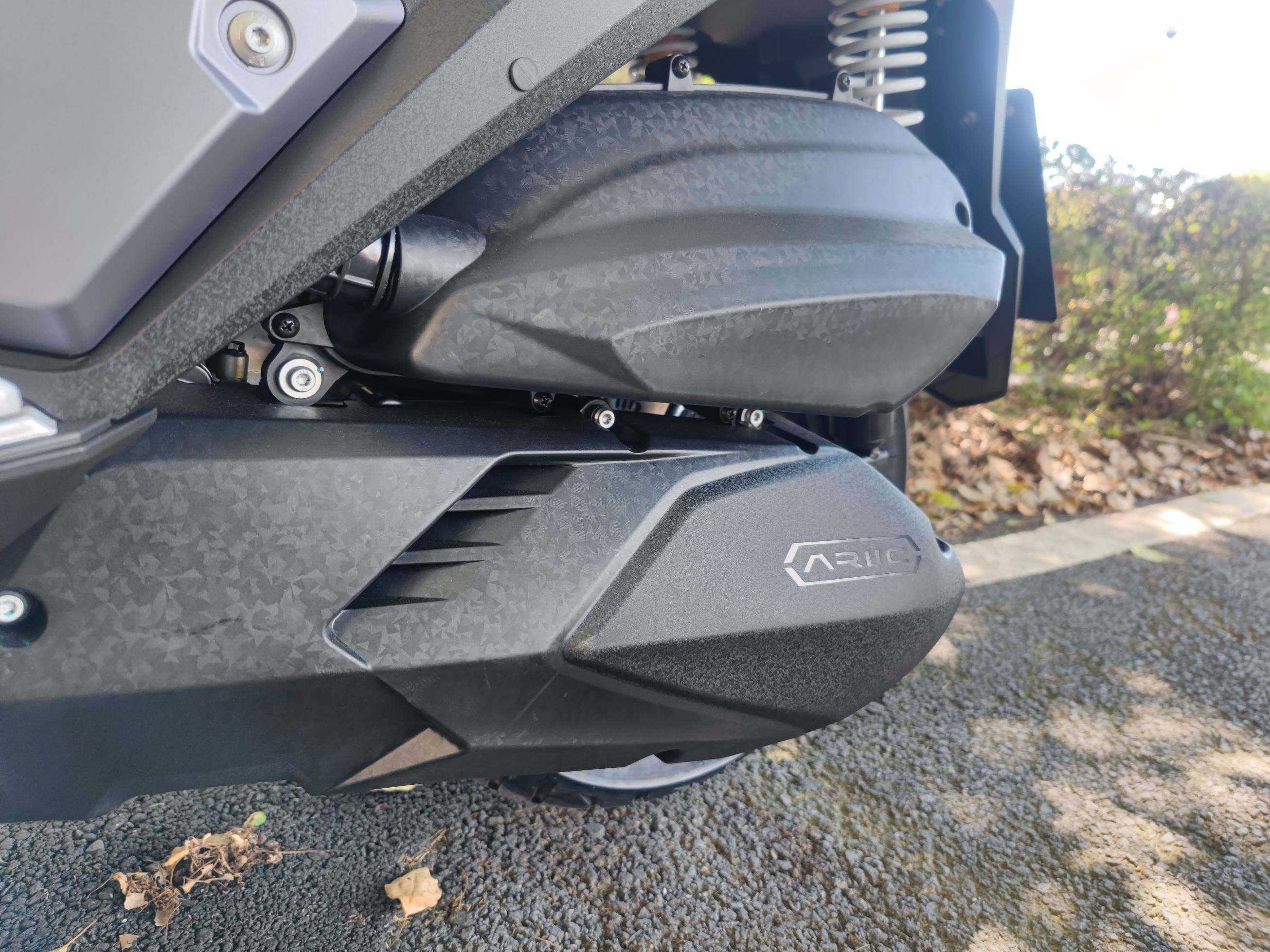 接下来看看刹车以及其他部分的做工。首先说说这个双碟浮动前刹,在这一级别或者这一级别的其他车型中,这样的配置对于一台踏板来说的确有点用力过猛,不过这台250T版本上的前刹相较于之前的版本有所调整,没有一切评测中说得那么灵敏,相信力刻已经做了调节,目前就我使用下来的感觉灵敏中带一点线性,这样的话其实只要稍加适应就能习惯它。此外,还是要点赞力刻用料上的扎实。