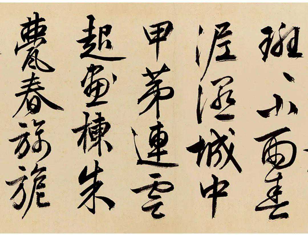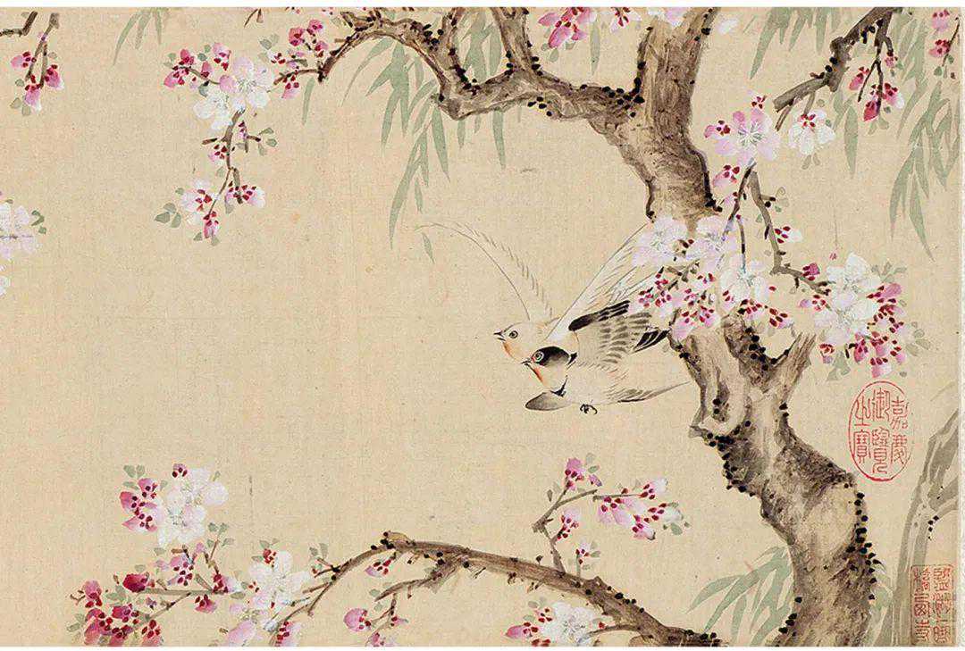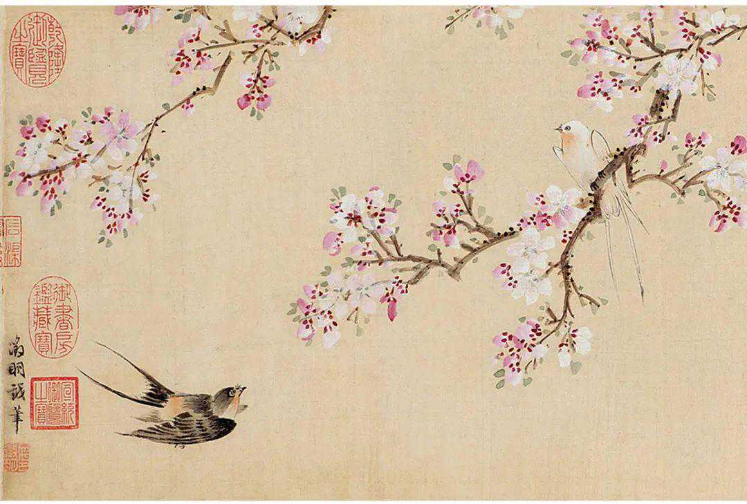 文徵明所绘也是一片江南春色。画中老树盘桓遒曲,枝杈参差,枝头桃花怒放,粉艳动人。花朵用胭脂加粉白调和,过度自然。花朵姿态万千,花朵间点点新绿,富有变化和层次。在粉红的时光中,春燕飞舞,或比翼双飞,或相对而鸣,使画面更富生机和活力。画面上粗细、动静之间的变化,构成画面结构的平衡感,笔墨若松动,结构则严谨,二者间的关系是相辅相成。