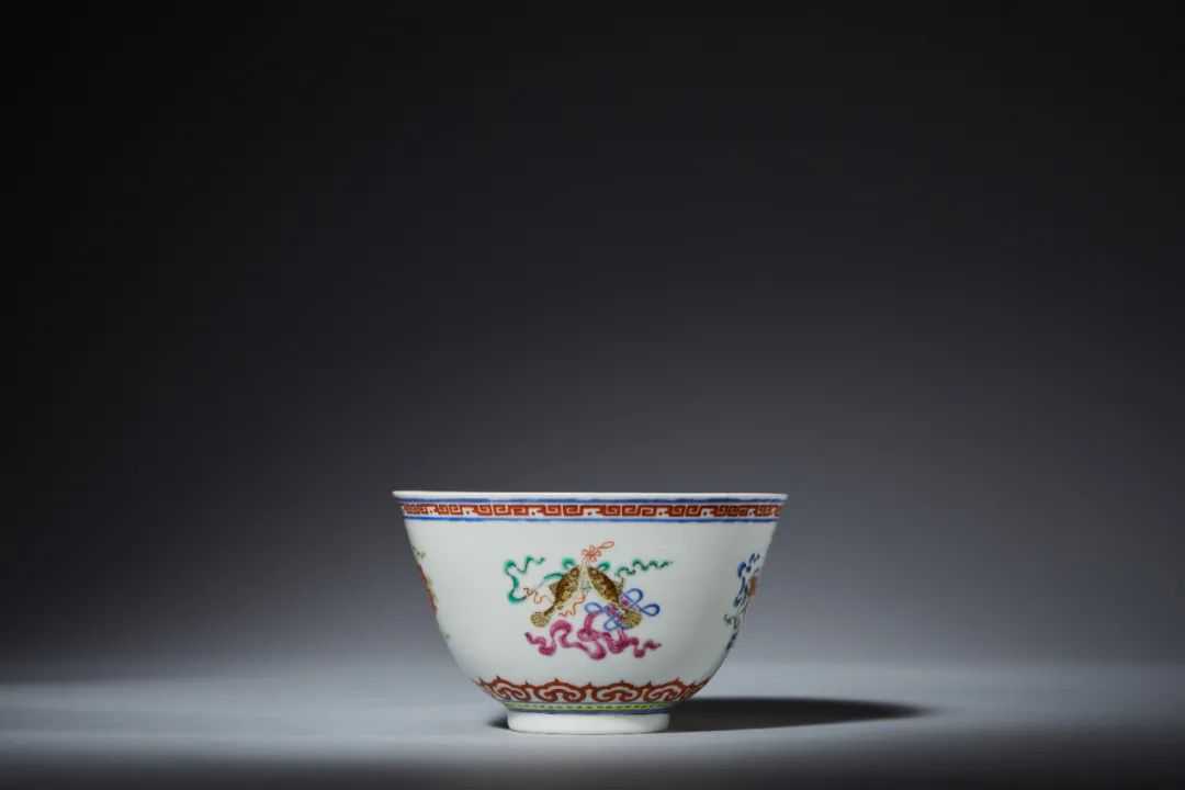 此碗撇口,深腹,圈足,造型秀致雅正,胎薄质细,釉面润洁。碗外壁绘粉彩八宝吉祥图案,其排列顺序为轮、螺伞、盖、花、瓶、鱼、长、宝器周围彩带、祥云环绕,一幅祥瑞景象。全器轻盈秀雅,典雅大气,纹饰华美,绘工精丽,所饰图纹发挥出渲染技法的特性,发色清新华丽,色彩搭配雅致和谐,予人呈现精秀华贵之气。