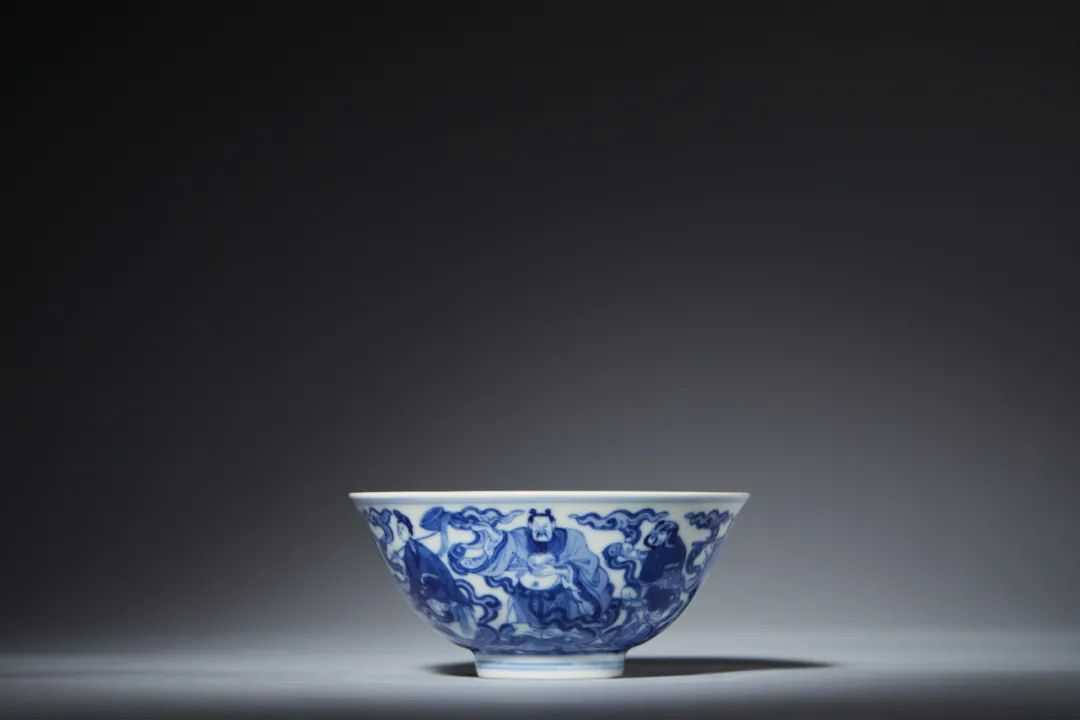 拍品敞口,弧腹,圈足。以青花绘纹饰,碗内青花双弦两周分列口沿、碗心,以作区隔。内壁釉色清洁爽亮,碗心绘福、禄、寿三星松林齐聚,寿星高额举桃,福星束发伸指,禄星持杖旁观,旷空山野之间,逸趣闲情。碗外青花双弦两周分列口沿、圈足;外壁青花绘「八仙过海」。汉钟离袒腹举捧还魂扇;李铁拐拄杖紧握仙葫芦;蓝采和宽衣洒带挑花篮;韩湘子凝神远望吹横笛;曹国舅高抬绰板;张果老谨抱鱼鼓;吕洞宾负剑直身,何仙姑轻盈持莲,八仙共踏行于海,周流云飞卷,衬托仙容善貌。青花八仙图碗系清代官窑经典品种,创自雍正时期。乾隆朝将细节稍作变化,使其定型成为后世典范。南京博物院藏例,可资参阅。
