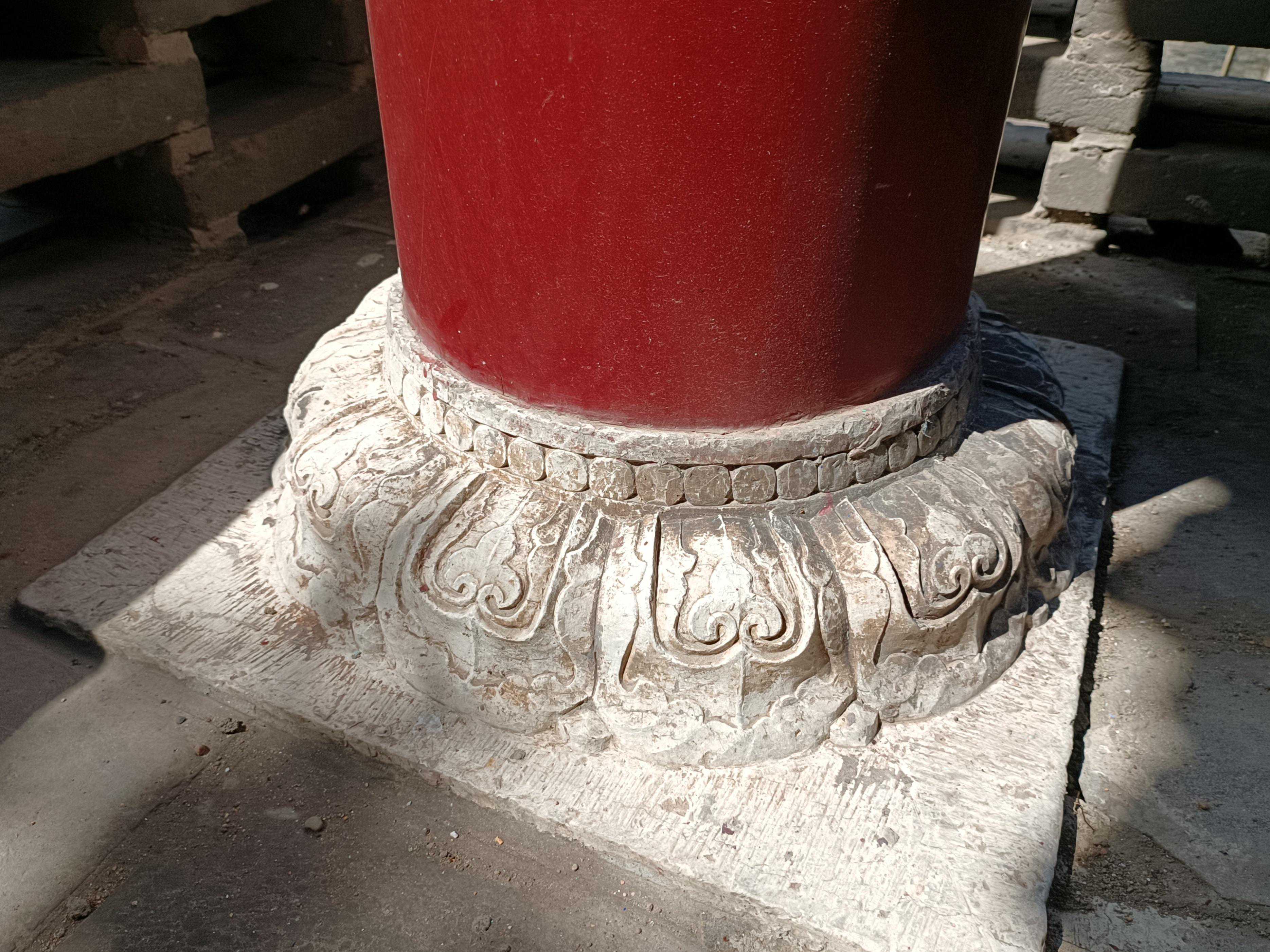 对比以上三处宝珠吉祥草彩画,它们的构成相同,中心均为三宝并列周环莲,从侧面生出卷草。宝珠及雷神的原型忍冬草都为东方佛教纹饰,传入中国的时间可追溯到唐代。后成成熟的公母草样式,常见于藏传佛教建筑中,雕于梁枋、须弥座等构件上。在明十三陵的诸多须弥座上,虽然也有卷草纹饰,但并不是以公母形式出现。抛开纹饰复杂程度不论,上述三种宝珠吉祥草构图与公母草有明显的同源性,卷草的绘成方式受当地艺术审美的影响,表现出了较为自由的形式。