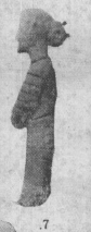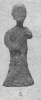 5.泥俑12件。出于墓8与19。女立俑3件。高13厘米。瓜子脸,高鼻,眉,眼均着墨色,头后盘鬓有簪,颈稍长,身着黑底红花长衣,对襟于背后,窄袖翻口,衣襟下部饰红边,腰部缠红带绕三匝垂于左下方,外又束红带垂于腹部,作人字状(彩色版,图四5—7)。
