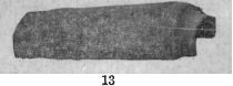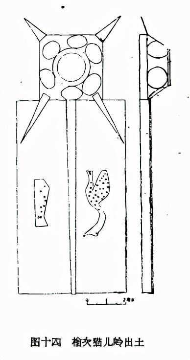 在墓14、15的棺木的西边各发现一件用途不明的东西,由长方形(长16.5,宽6,厚0.4厘米)和方形(直径4厘米)两块石板组成;长方形的为素面,方形的较厚,底方上圆,圆周雕椁边,内有四个连弧纹,中央又雕四个圆圈。1958年榆次市猫儿岭第5号汉墓亦发现一件,质料相同,唯于石板上贴有骨圈,骨片、骨岛角等(图十四)。
