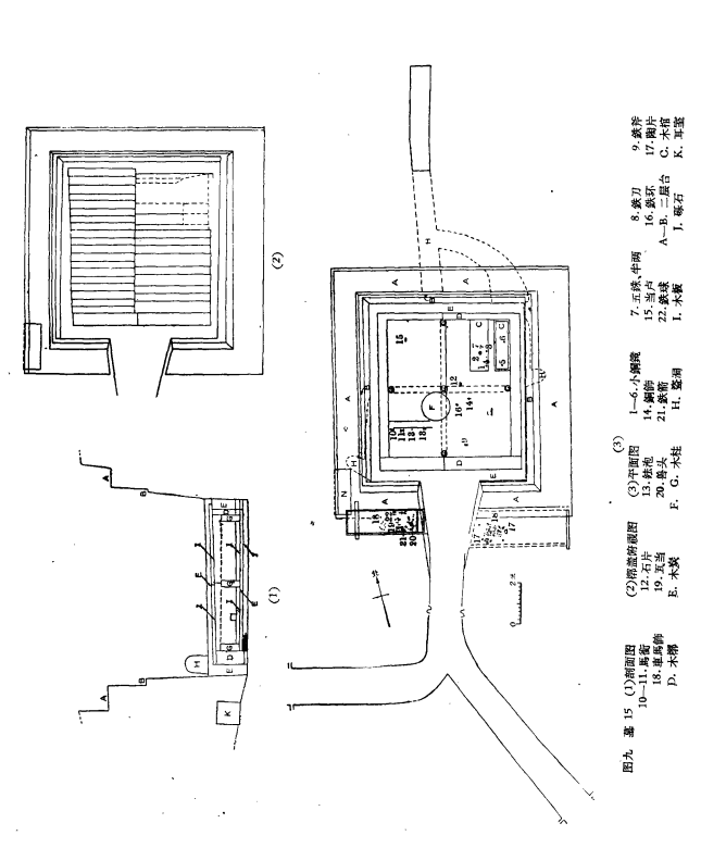墓15为方形整穴,墓14为长方形洞室,这两墓的内部都筑有木椁室,基本相同。