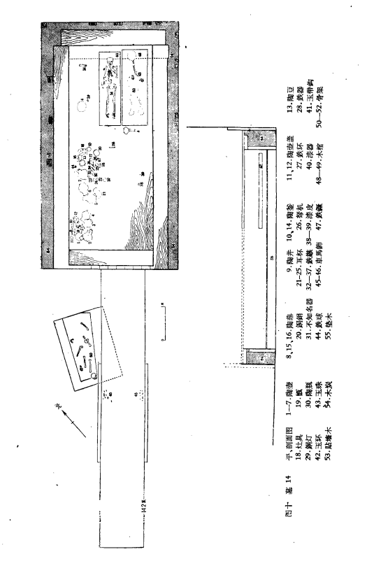 (2)墓14(图十)为长方形土洞墓,方向40°。墓室长7.2,宽4.04米。斜坡式墓道居南,长14.2,宽1.3,深2至8米。