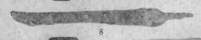 铁刀2把。一为环首刀,长15.8,宽1.2厘来,细长,刀头刃部抹角,刀与背同厚。另一把(墓15),长33.6厘来,习部略呈弧形,唯绛抹一角呈凸弧形,习薄,背厚,柄短(图十一,8)。