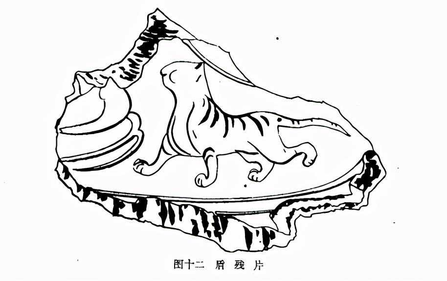 盾残甚,略可看出为长方形,长约50厘米,宽略短于长,四边抹角,上漆绘,缸底黑边,内绘制白色老虎等形象(图十二)。