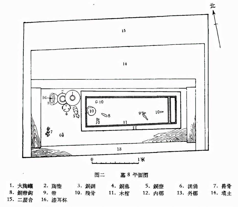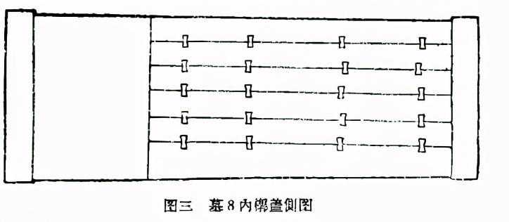 墓8较大,二层台留在东西和南壁的下部,高1.14,南宽0.9,东宽0.16,西宽0.08米。盖板由六块东西纵列的木板组成,上面分四排各用五个细腰连接成一块大板(图三),盖于外椁的里边。