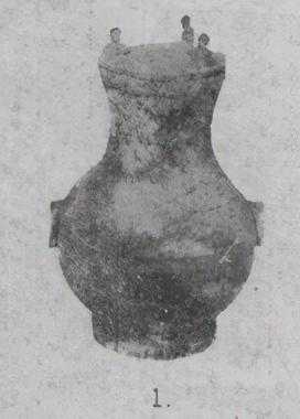 铜壶(墓8)1件。口微敞,圆腹,圈足、有盖,腹部饰三道弦纹,并有对称的铺首衔环,盖上有三个小钮,下面有子母口与口吻合。通体高16.5厘米(图四,1)。