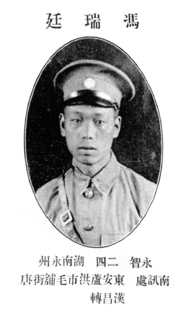 冯瑞延湖南永州人,黄埔军校第五期步科第二学生队,1902年生,别号:永智,籍贯:湖南永州,部别:黄埔军校第五期步科第二学生队,其他无记录,入校通信地址:东安芦洪市毛苗街唐汉昌转。
