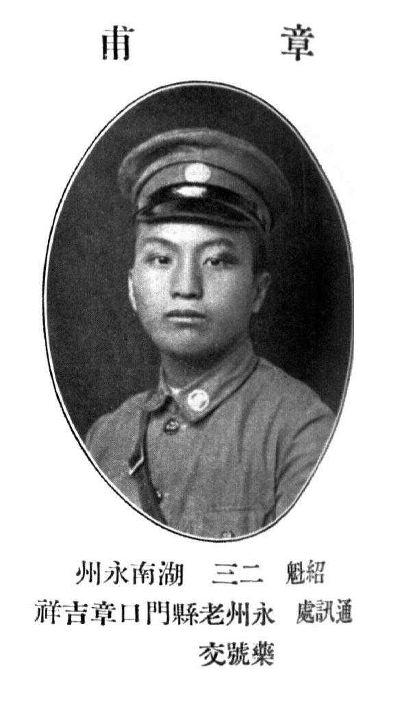 章甫湖南永州人,黄埔军校第五期步科第一学生队,1903年生,别号:绍魁,籍贯:湖南永州,部别:黄埔军校第五期步科第一学生队,其他无记录,入校通信地址:永州老县门口章吉祥药号交。