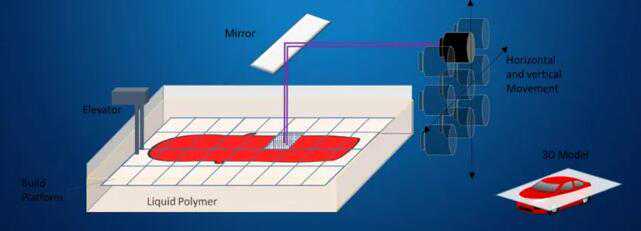 立体光固化成型设备包括一个树脂托盘、一个移动平台(Z轴)、一个刮削系统(X轴)、一个紫外激光器、聚焦光学元件和一个振镜(X和Y轴)。激光束根据提供给打印机的数字3D模型扫描液态树脂表面。一层固化后,平台下降一层,再固化下一层。打印件体积有多大,就需要多少层就进行多少次打印。