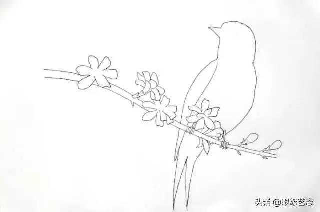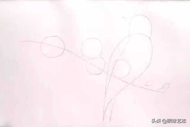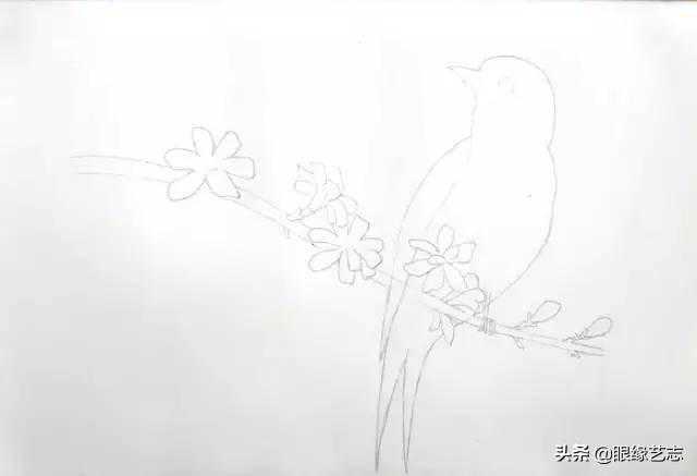 1.构图:观察花和鸟的外形特征,迎春花呈圆形,燕子尾巴像剪刀。用铅笔以几何图形、线条的方式画出大概轮廓,下笔要轻,便于擦掉。