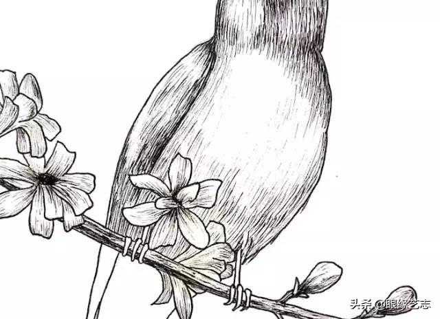 7.腹部:跟头部排线差不多,两次排线,也要留白,腹部线条较长,留白处的线条轻轻地画就是断断续续的。第二次排线加密翅膀边缘。