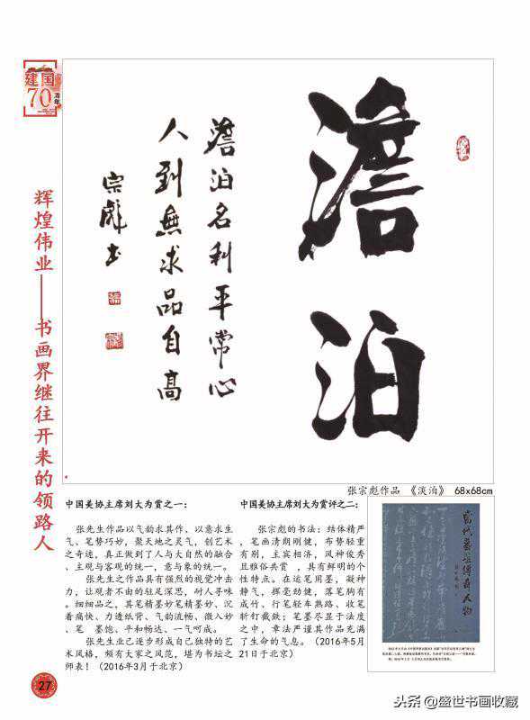 中国文联神州杂志社主编为建国六十五周年推荐沈鹏、范曾、张宗彪三位为“走向世界的人民艺术家”。并由张海主席题写了书名——《神州名家书画》。三人集面向海内外公开发行。