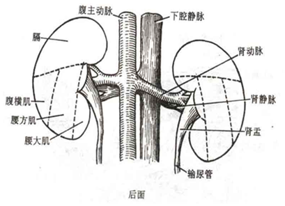 肾是实质性器官,形似蚕豆、前后略扁,左、右各一。位于腹后壁上部,脊柱的两侧。左肾上平第12胸椎上端,下平第3腰椎上端;右肾上、下各平12胸椎和第3腰椎下端。右肾略低于左肾半个椎体的高度。