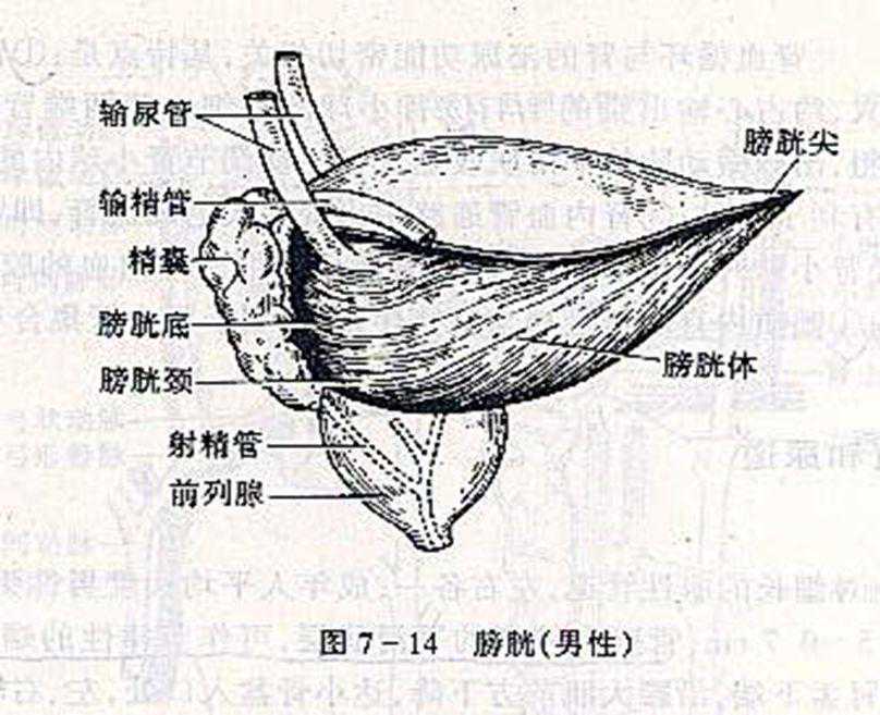 三角的尖向前下方,尿道内口开口于此。膀胱三角的两侧后两角是输尿管开口的地方。膀胱壁由内向外为黏膜层、肌层和外膜。肌层由平滑肌纤维构成,称为逼尿肌。